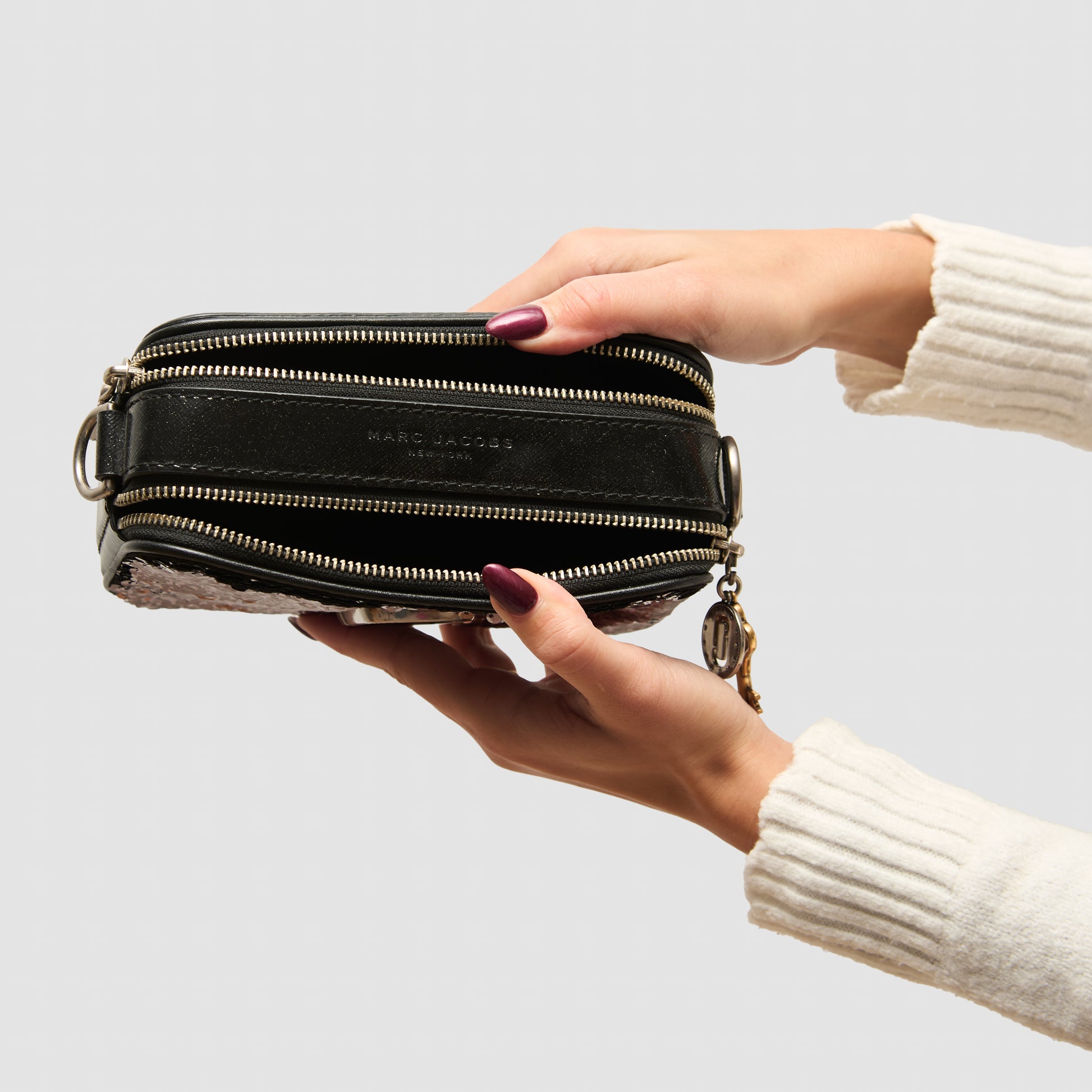 This Marc Jacobs Snapshot crossbody is your ticket to turning heads wherever you go. Bursting with personality, it combines dazzling silver and black sequins with chic leather accents and gleaming silver hardware for maximum impact. The bold zebra-print strap is fully adjustable and detachable, so you can switch up your look whenever the mood strikes. Smart dual exterior pockets and an interior wall pocket keep your essentials organized, while dual zips keep everything secure. Plus, it comes with an adorable keychain to add even more personality to your collection.