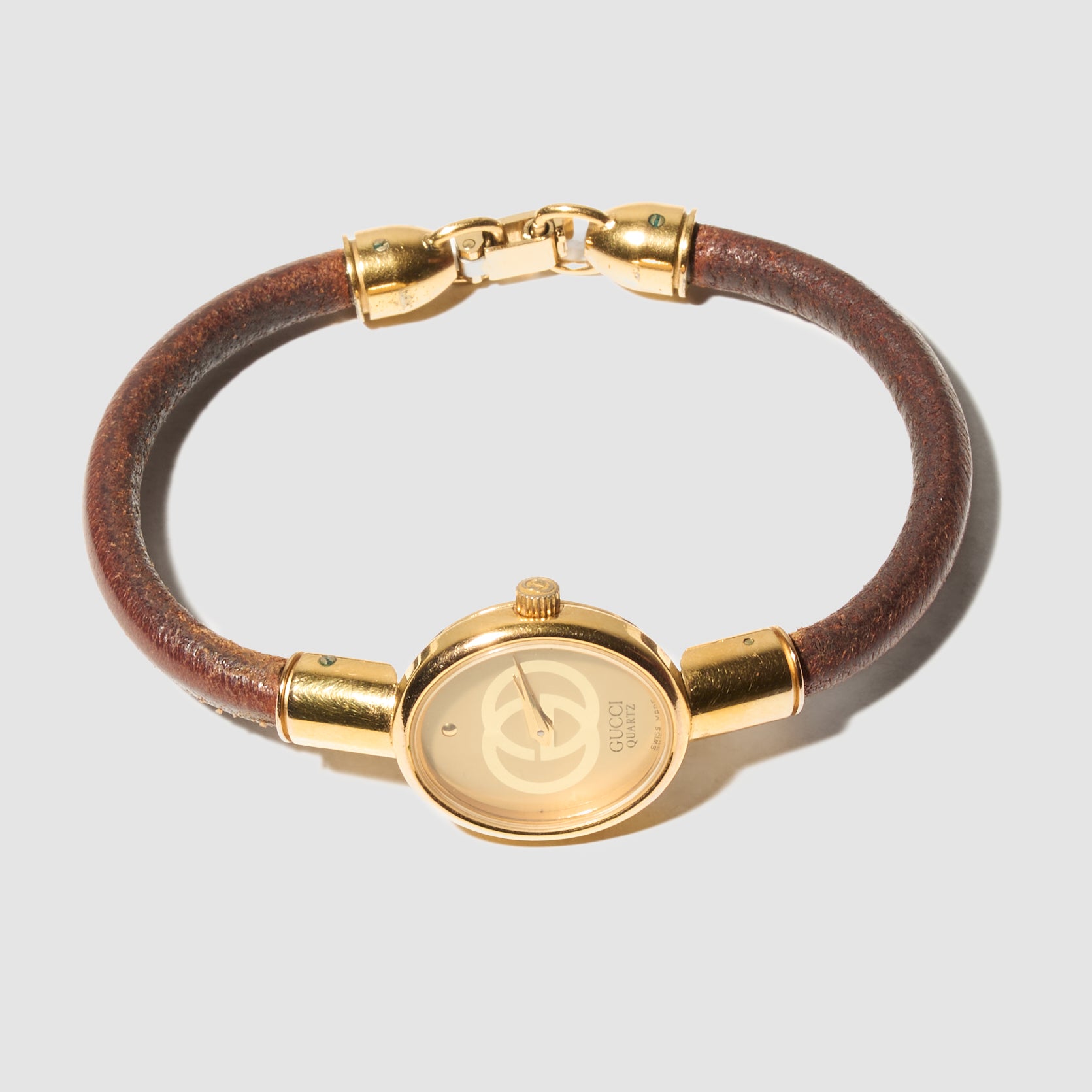 Elevate your collection with this distinguished vintage Gucci bangle watch—a rare find that marries heritage craftsmanship with refined style. The luminous gold face radiates luxury, complemented by a supple leather band that ages beautifully with wear. The intuitive gold clasp provides secure, hassle-free fastening. Whether worn as a bold standalone statement or layered with complementary pieces, this versatile timepiece commands attention. An exceptional gift choice that transcends trends and seasons, delivering timeless value and undeniable prestige.